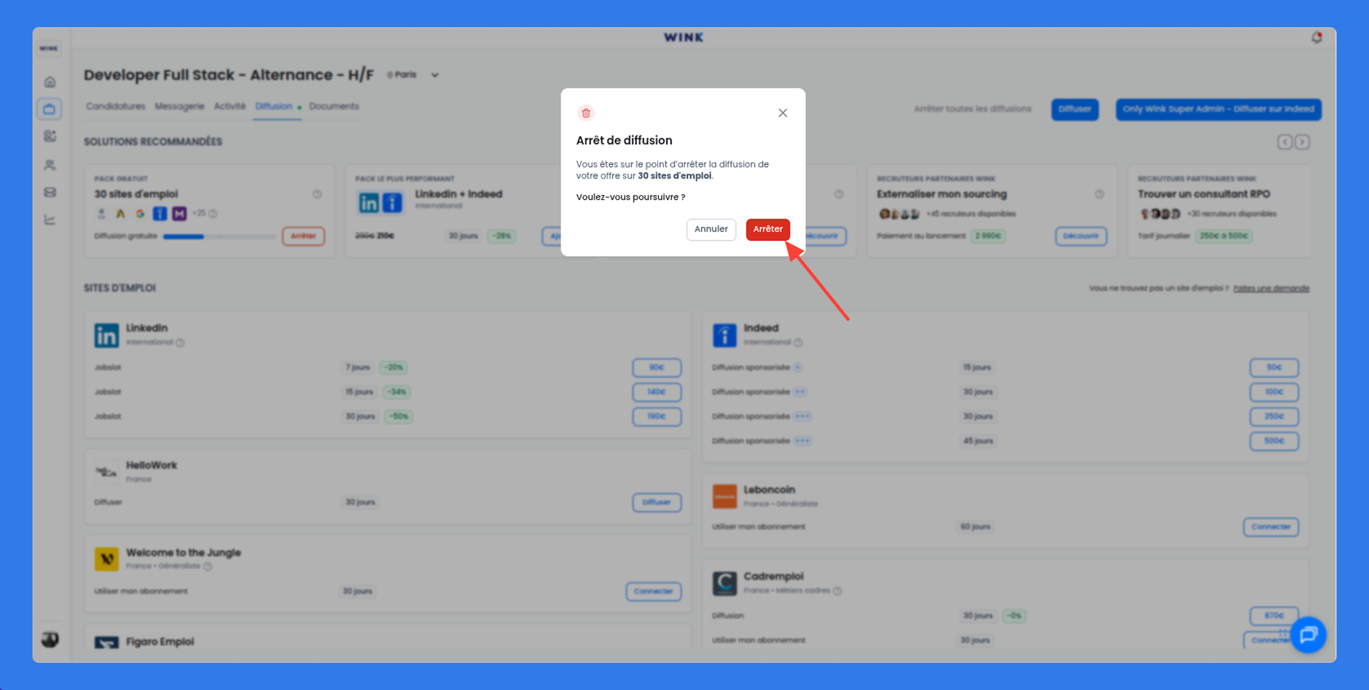 - Ouvrez l'offre d'emploi que dont vous souhaitez couper la diffusion