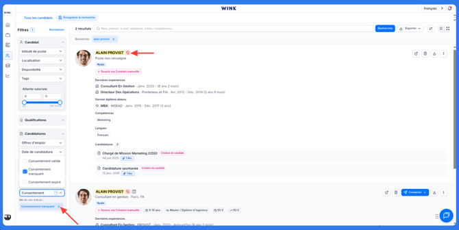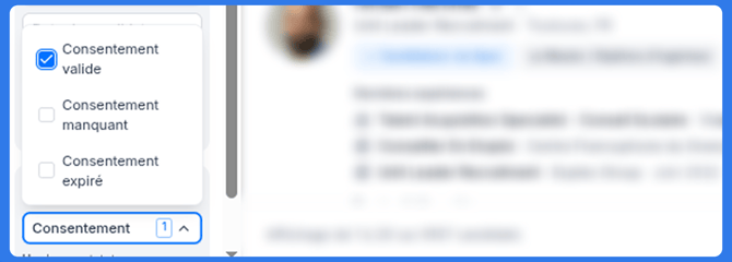 Ce filtre vous permet de piloter la gestion des données personnelles de vos candidats, conformément à la réglementation européenne (RGPD). Il est essentiel pour garantir que vous ne conservez et n'utilisez que les profils autorisés.
