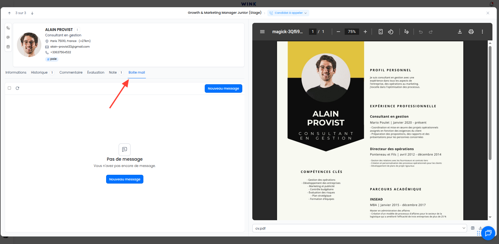 Sur votre interface Wink, lorsqu'un candidat est ajouté à un processus de candidature (manuellement ou automatiquement), une fiche candidature se crée. À partir de cette fiche, vous allez avoir la possibilité d'accéder facilement à de nombreuses informations et fonctionnalités.