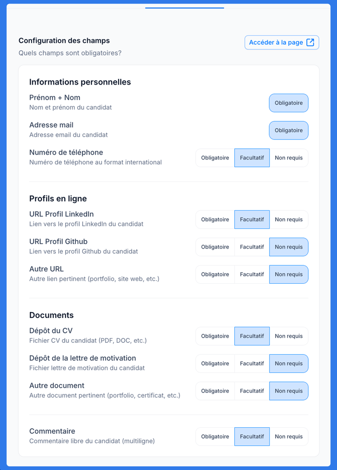Le principe est simple : si vous décidez, par exemple, de rendre le numéro de téléphone facultatif ou obligatoire, il disparaîtra ou apparaîtra instantanément de votre page côté candidat. Magique, non ?
