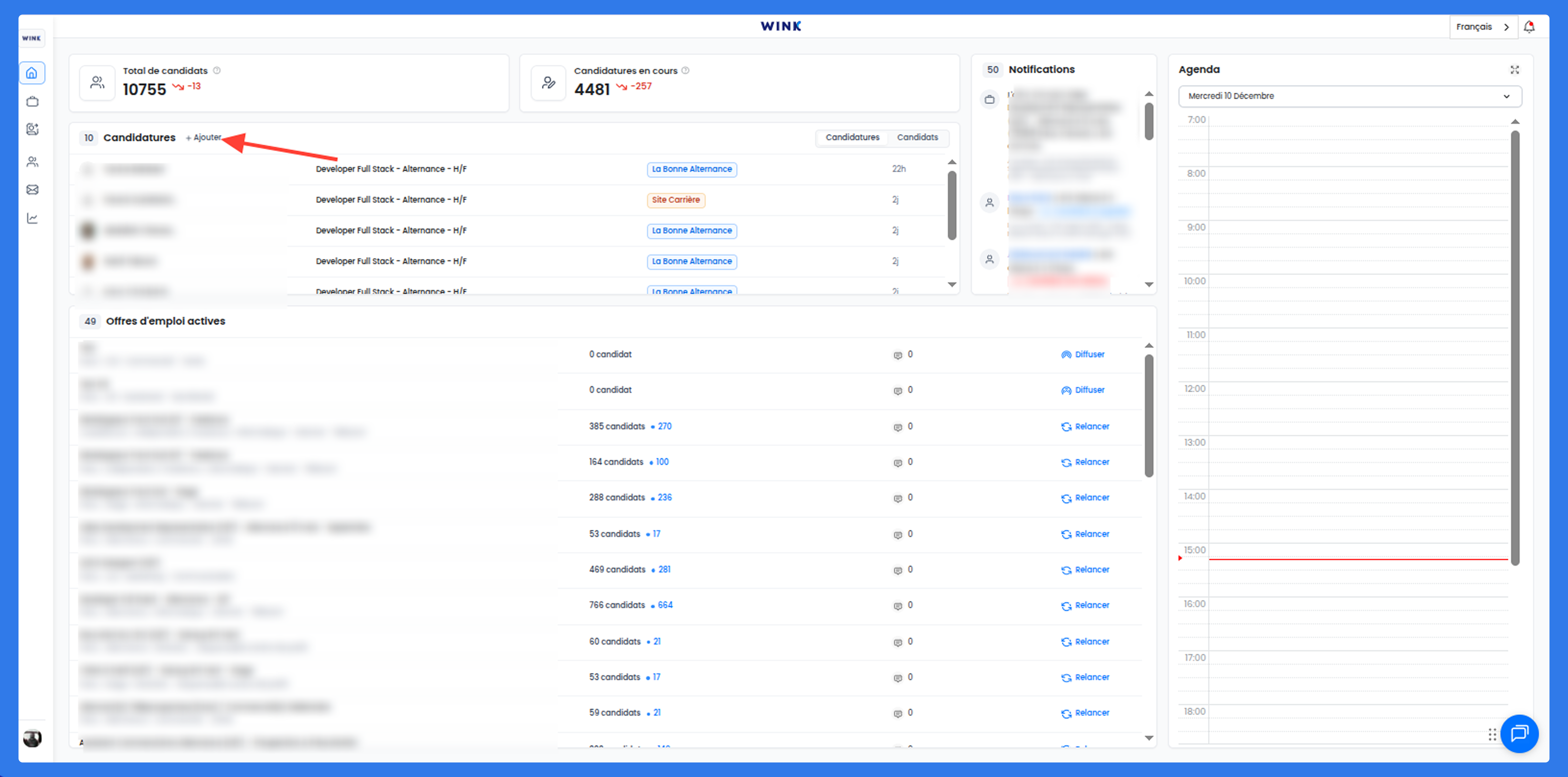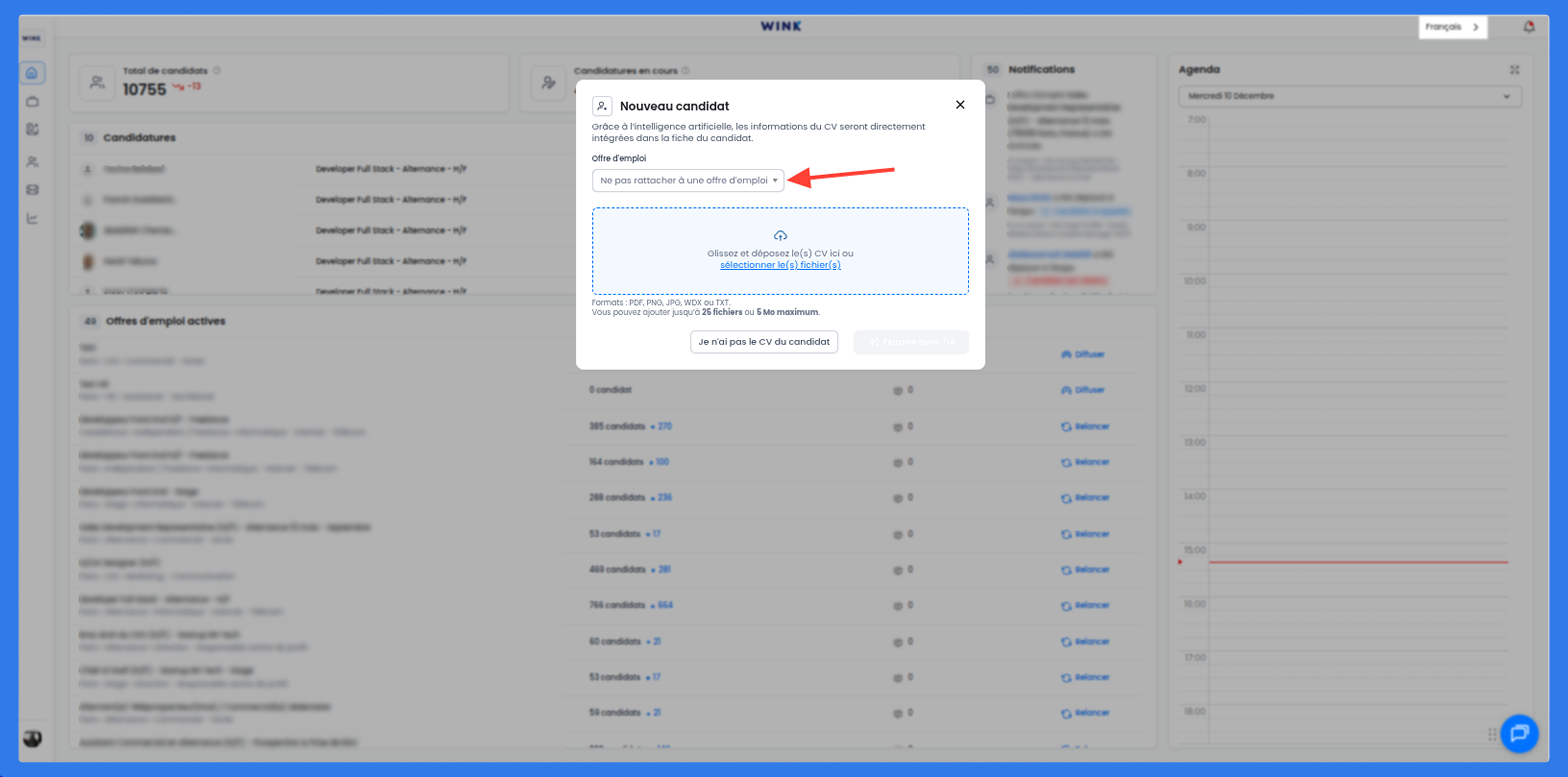 Vous pouvez ajouter de nouveaux candidats en cliquant sur le bouton "ajouter". Vous devez alors importer manuellement le CV du candidat ou directement votre CVthèque en choisissant l'offre d'emploi dans laquelle vous désirez qu'il intègre le processus de recrutement dans la dropdown "Offre d'emploi". ✌️