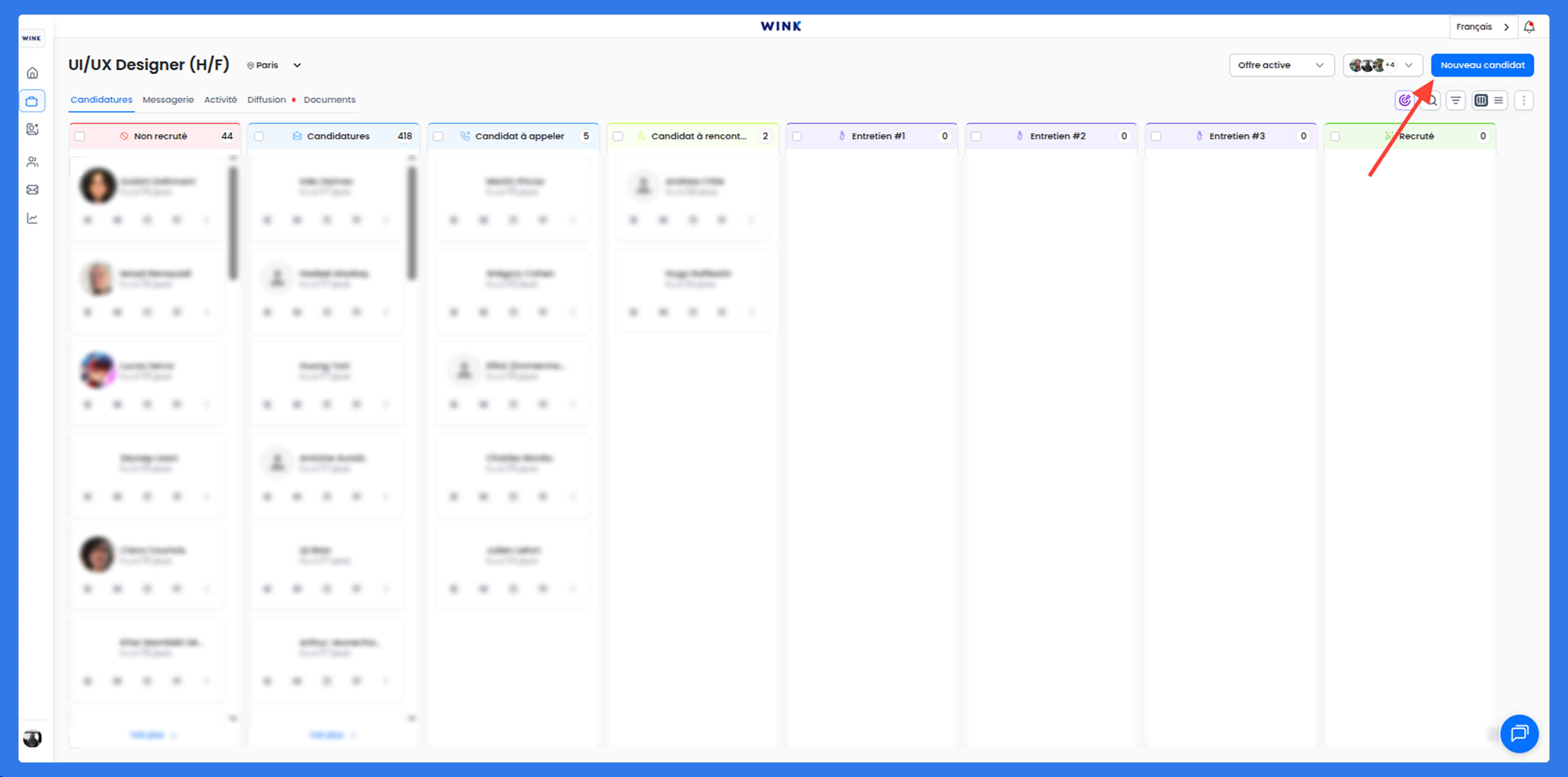 Ici, vous pouvez ajouter et inviter un nouveau candidat dans le processus de recrutement en cliquant sur le bouton "Nouveau candidat". 👍