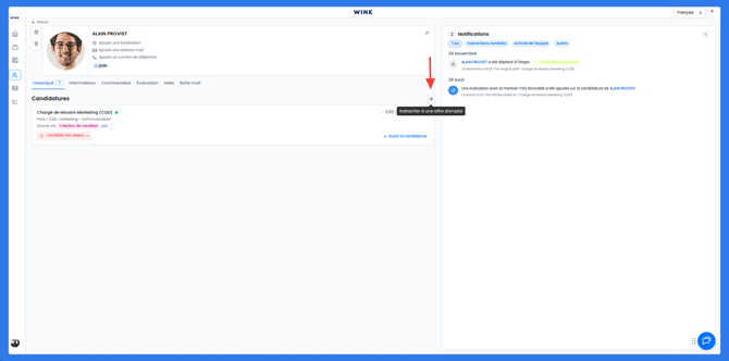 Rendez-vous dans la fiche candidat du talent que vous souhaitez incorporer dans une nouvelle offre d'emploi. Cliquez sur l'onglet "historique" puis sur le "petit plus" pour ajouter le candidat dans un nouveau processus de recrutement.