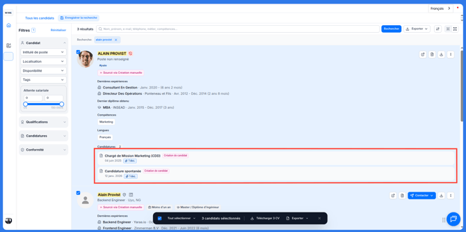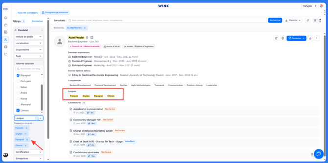 Rechercher un candidat grâce aux filtres