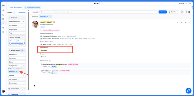 Vous pouvez donc rentrer n'importe quel mot clé et s'il est contenu dans le CV du candidat il ressortira.